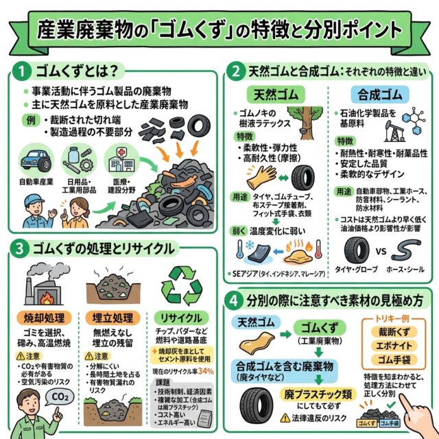 天然ゴムを主原料とするものは「ゴムくず」に分類され、産業廃棄物として取り扱われます。
