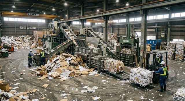 産業廃棄物として排出された紙くずは、古紙回収業者やリサイクル工場を経て、新たな製紙原料として再利用されます。